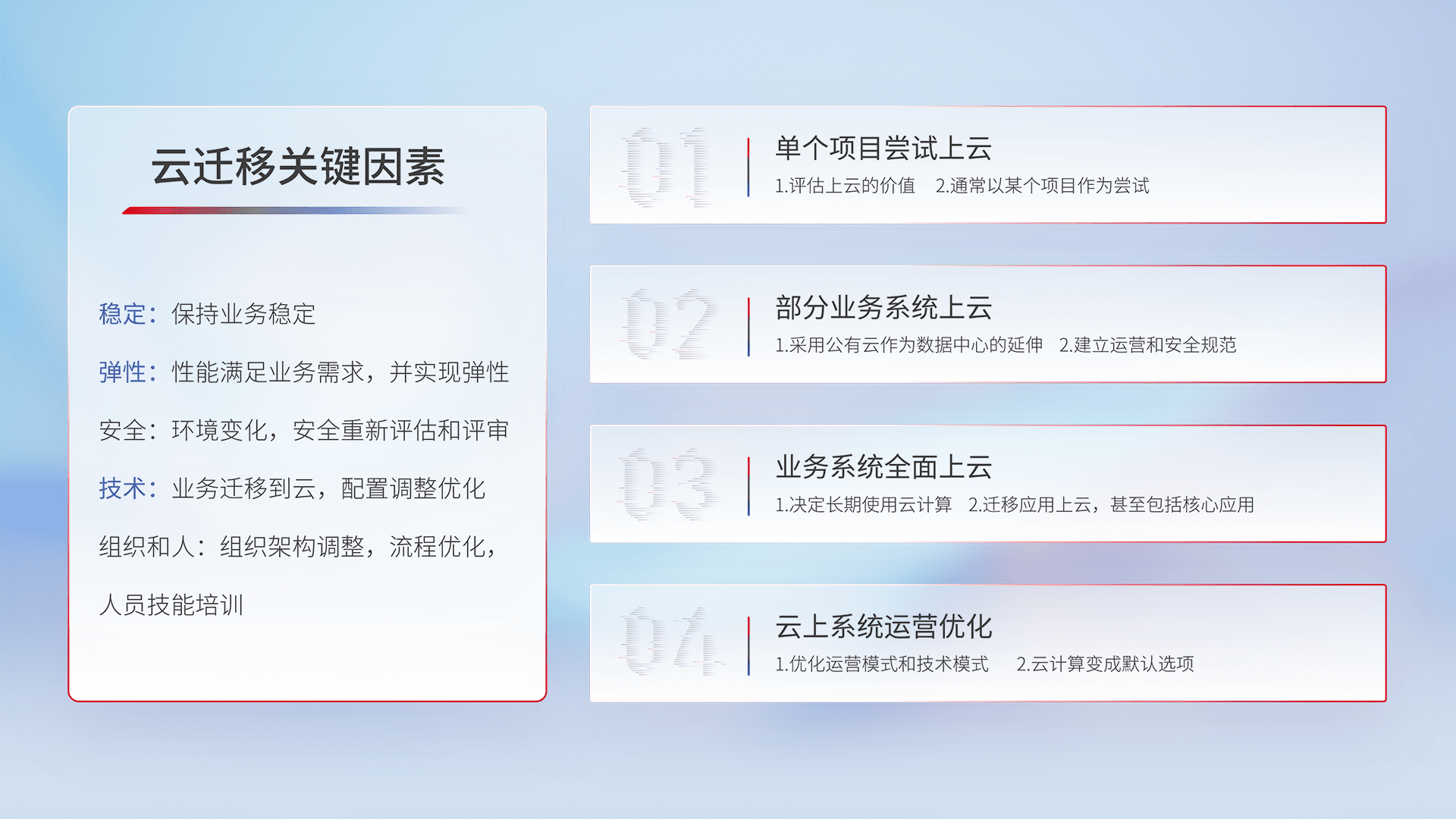 结合实际业务,,,,从规划设计、、、云平台选型、、、、云原生改造、、、、数据迁移、、集成交付,,,迁移全过程为客户识别最佳上云路径,,,,做好风险识别管理,,,设计网络架构、、、、身份权限、、安全审计合规、、、、操作审计、、日志审计、、监控告警策略、、多站点容灾设计等,,,,对云上基础设施进行整体规划,,提升IT治理水平,,,,以满足弹性、、、高可用、、高性能的需求。。
